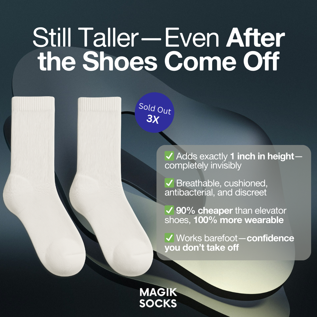 It’s time to leave behind clunky insoles and overpriced height shoes. Magic Socks do it better—comfortably, discreetly, and all day long.