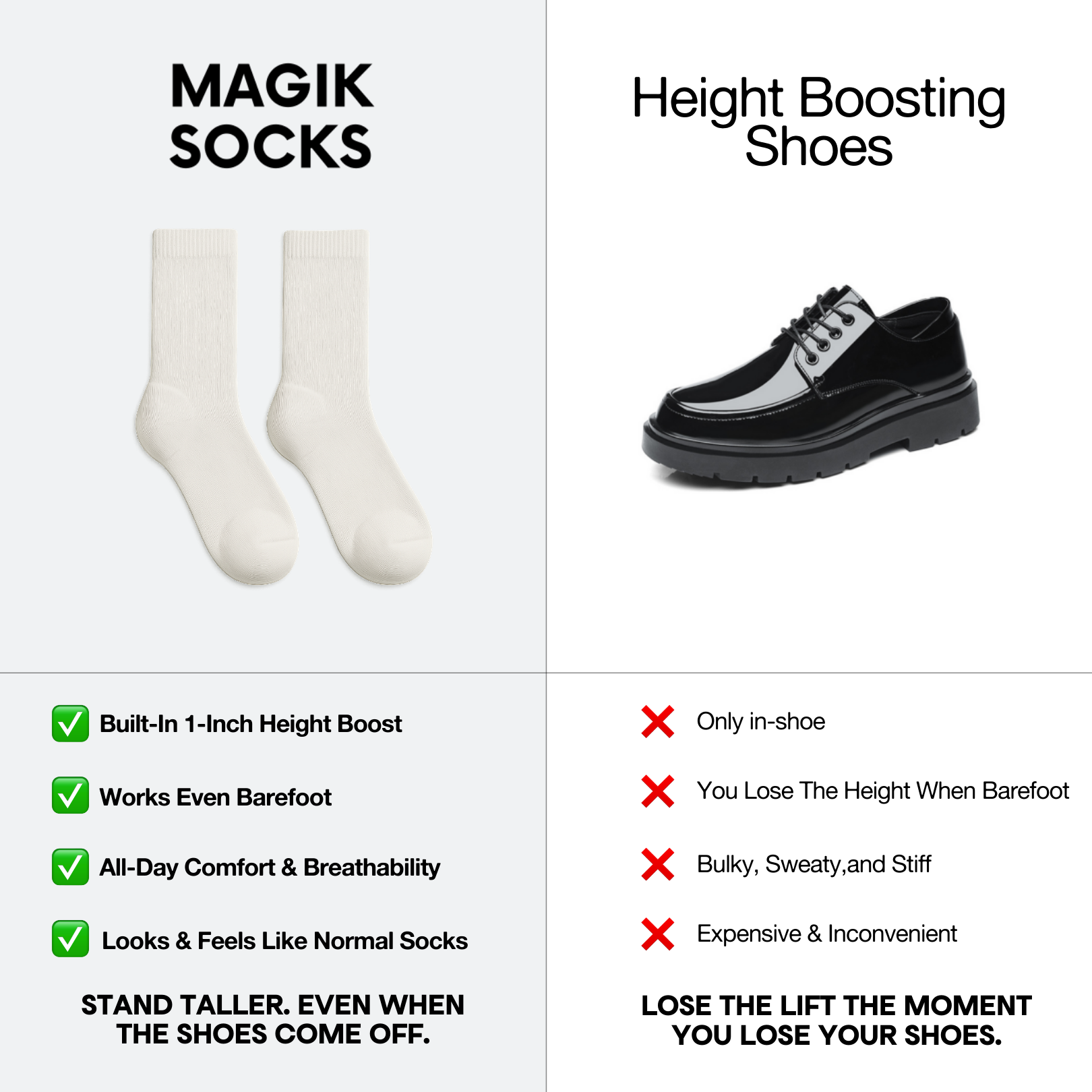 It’s time to leave behind clunky insoles and overpriced height shoes. Magic Socks do it better—comfortably, discreetly, and all day long.