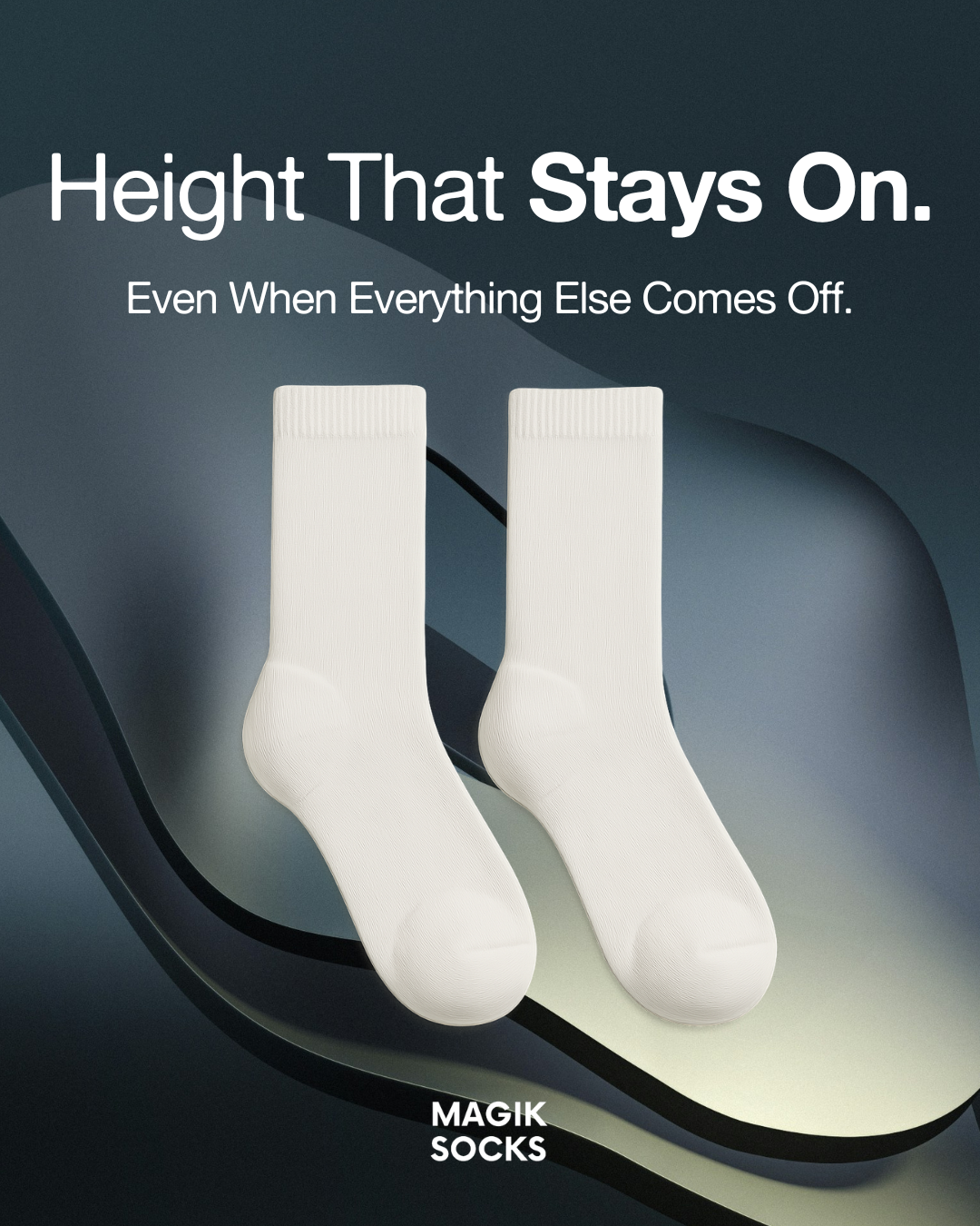 Unlike insoles or elevator shoes, Magic Socks keep your height boost even when your shoes come off—so your presence never dips, no matter where you are.